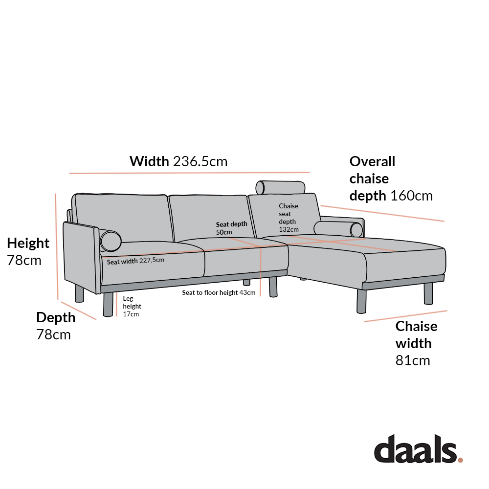 - Large 3-Seater chaise sofa size: W 236.5 x D 160 x H 88 cm