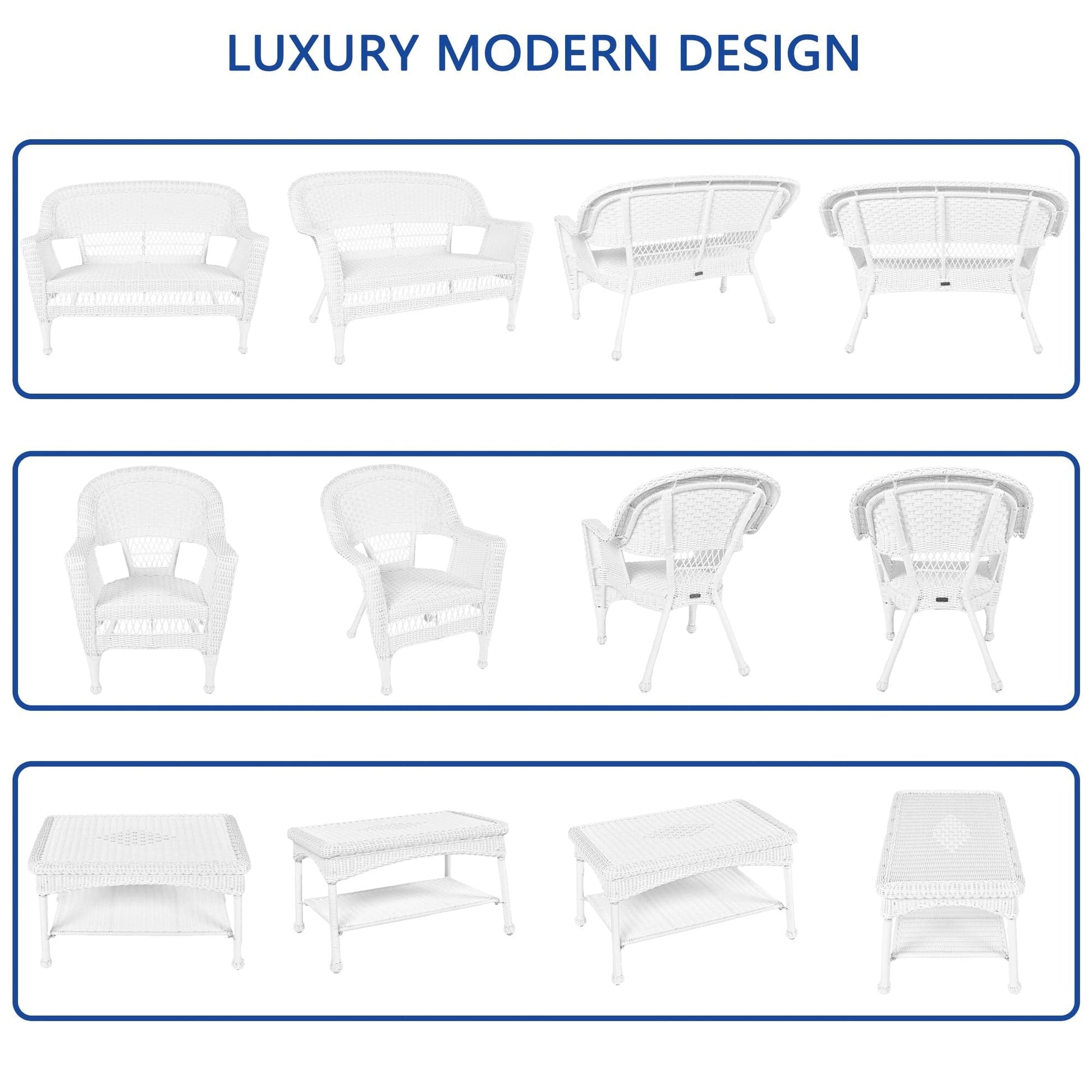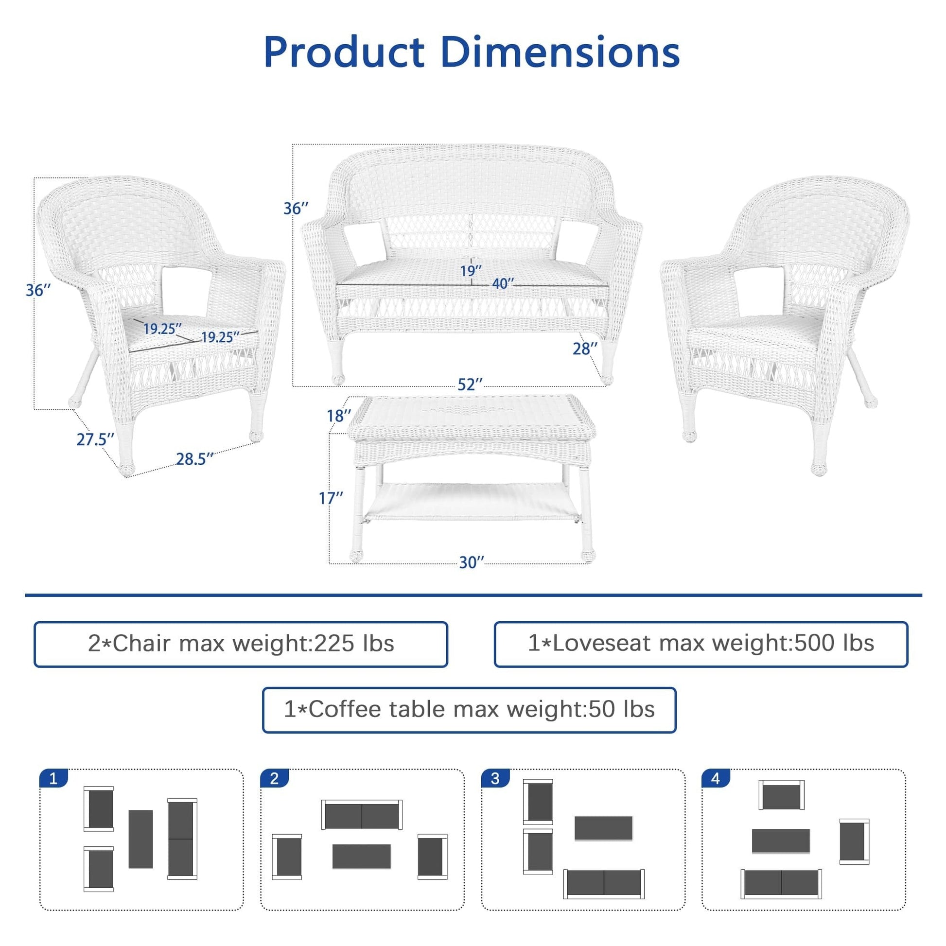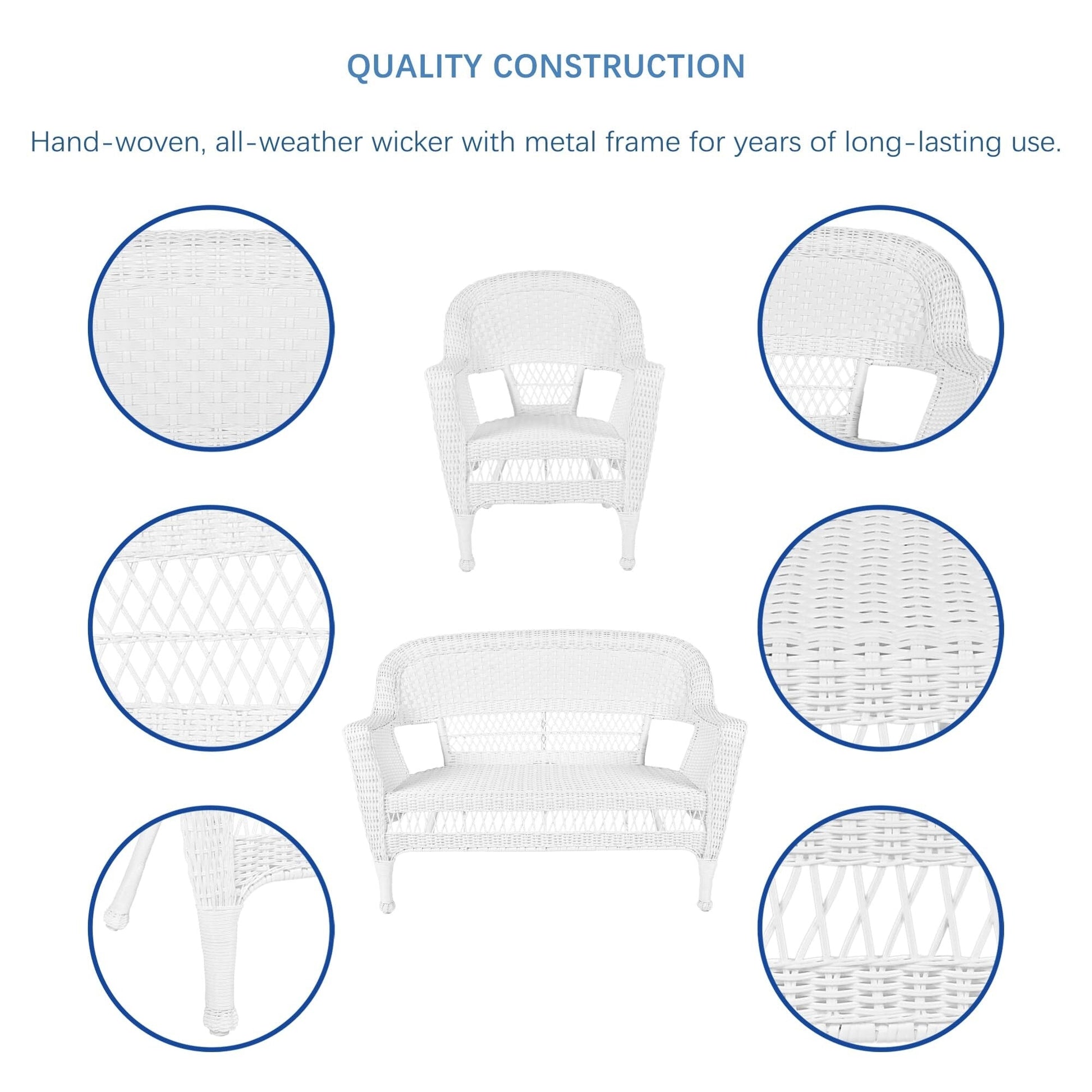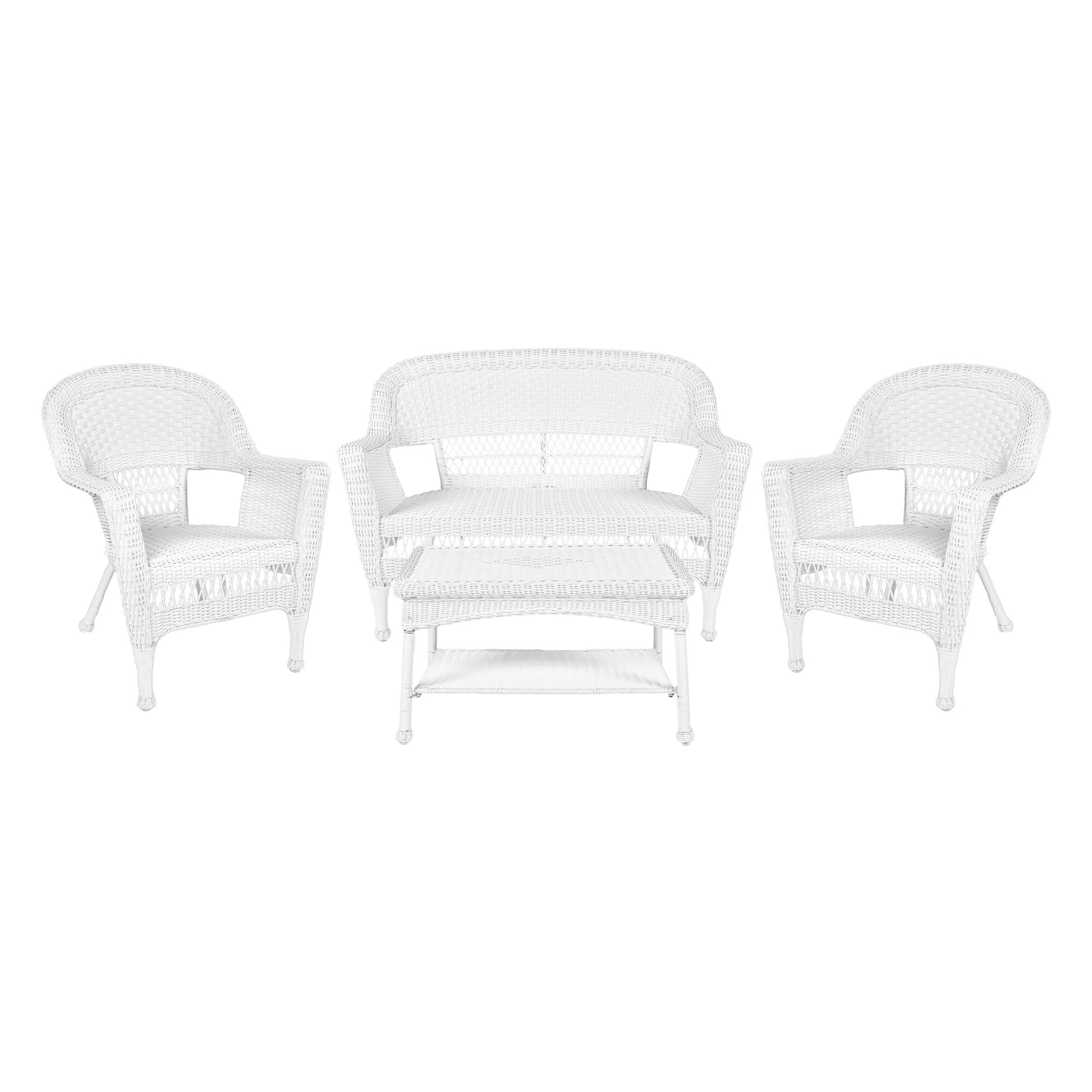 Relax in style and comfort with this exquisite 4-piece wicker patio set that will transform your outdoor living space. Built with high-quality, all-weather resin wicker and a sturdy steel frame, this set is designed to withstand various weather conditions and is perfect for indoor and outdoor use. The traditional white wicker design adds a touch of class to your patio or backyard, while the comfortable settee, two chairs, and coffee table provide ample seating for you and your guests.