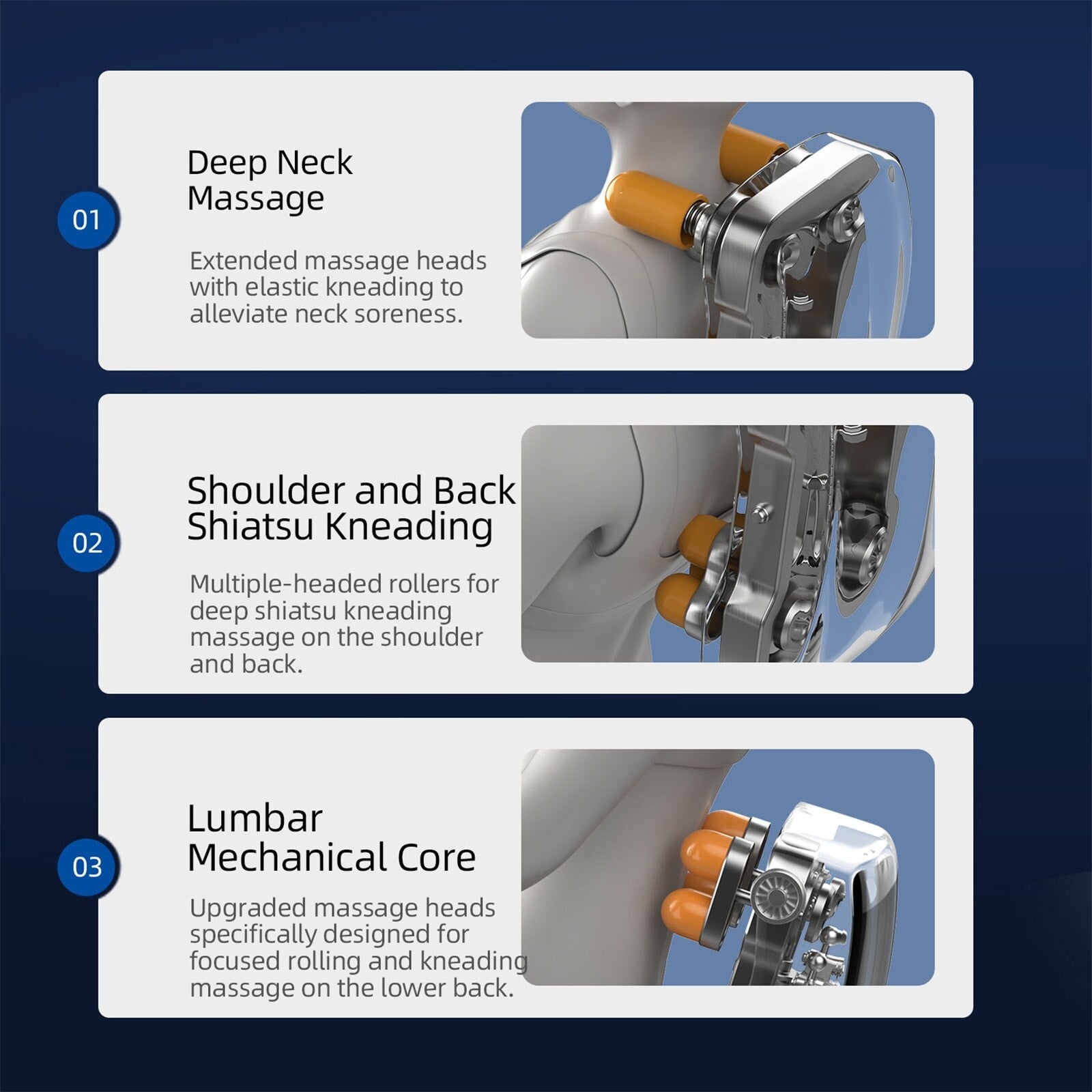 • 5 Massage Techniques: Enjoy professional-grade massage styles, including Kneading, Shiatsu, Clapping, Tapping, and Knocking, tailored to your relaxation needs.